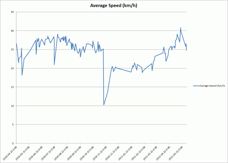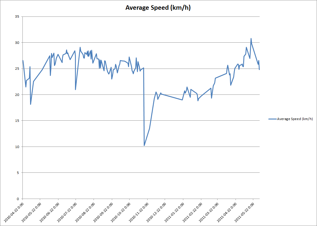 average speedJune 2, 2011playing around with historical ride data from Cyclemeter. Easy to tell when things got icy over the winter…