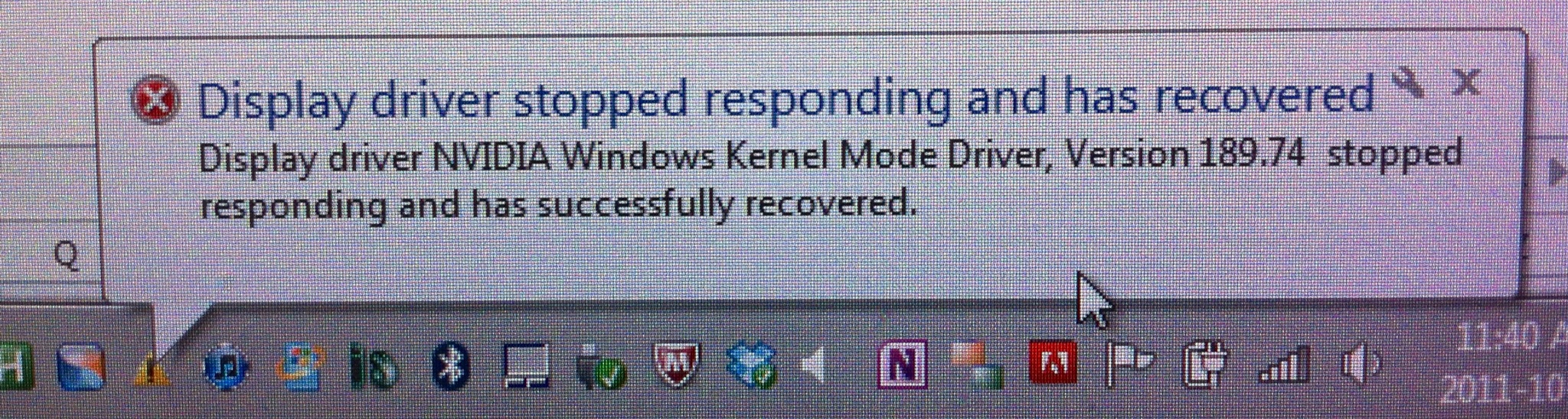 A sign of top quality softwareOctober 24, 2011Out of the blue. Boom. Black screen. Flash. Then an alert that the video driver dirtnapped. Impressive.