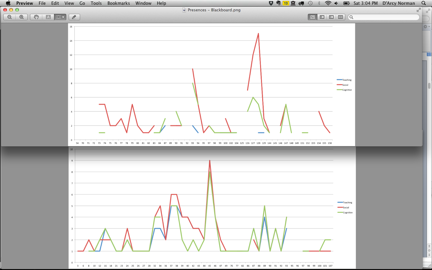 differences?June 2, 2012mapping the online discussions over time, showing posts coded into the three community of inquiry presences. Top is Blackboard. Bottom is WordPress. X axis is day-of-course. Y axis is number-of-posts-showing-Presence.