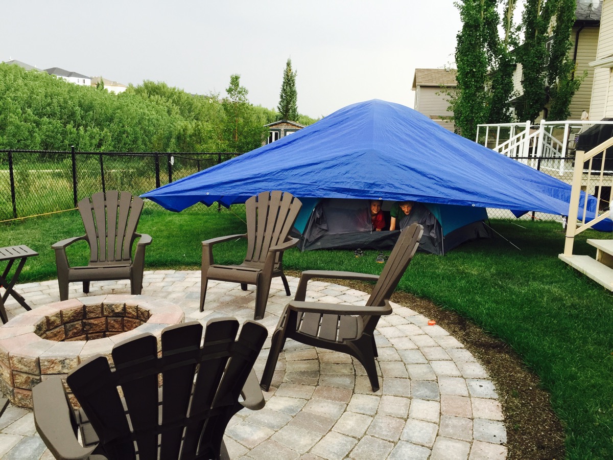 Backyard camping preparednessJuly 11, 2015 Sounds like a great thunderstorm building overhead. They insist on going ahead with backyard camping. Tarp applied. They should stay (mostly | kinda) dry.