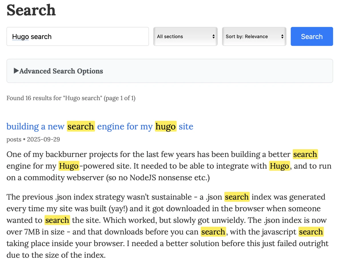 It started building a PHP/SQLite solution. Hugo can’t directly generate SQLite .db files, so it had to figure out how to convert the .js search index that was generated from my previous browser-based solution into the .db format that could be used with SQLite on the server. There was some back-and-forth to get around build errors and whatnot, and then it just worked. A fast, effective, customizable search engine with a good browser UI, with searches managed by a single PHP script on the server.