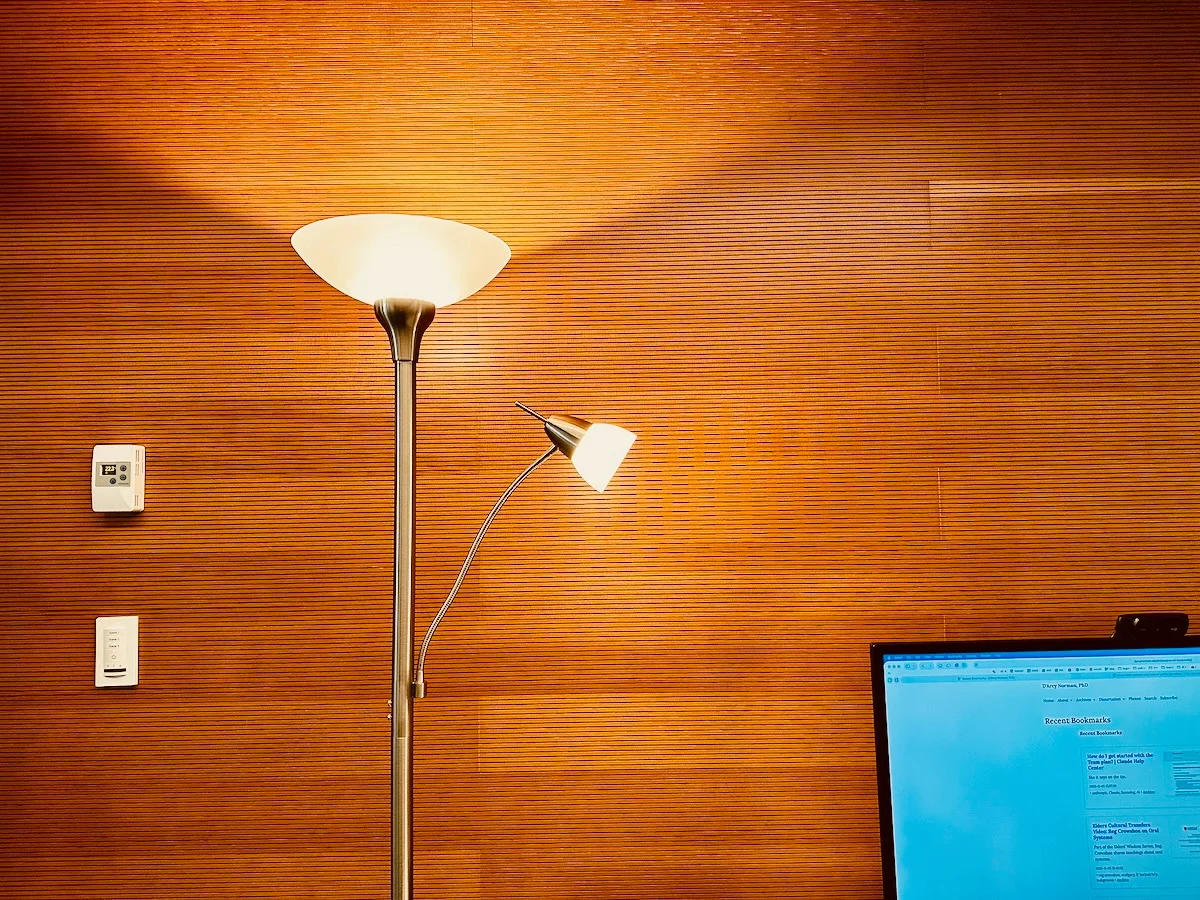 office lightingNovember 6, 2025office lightingThe image shows a modern lamp with a large shade and a smaller reading lamp on a wooden paneled wall, along with a computer screen visible in the background.Photo by D'Arcy NormanLast updated: November 6, 2025lightinginterior designworkspaceoffice