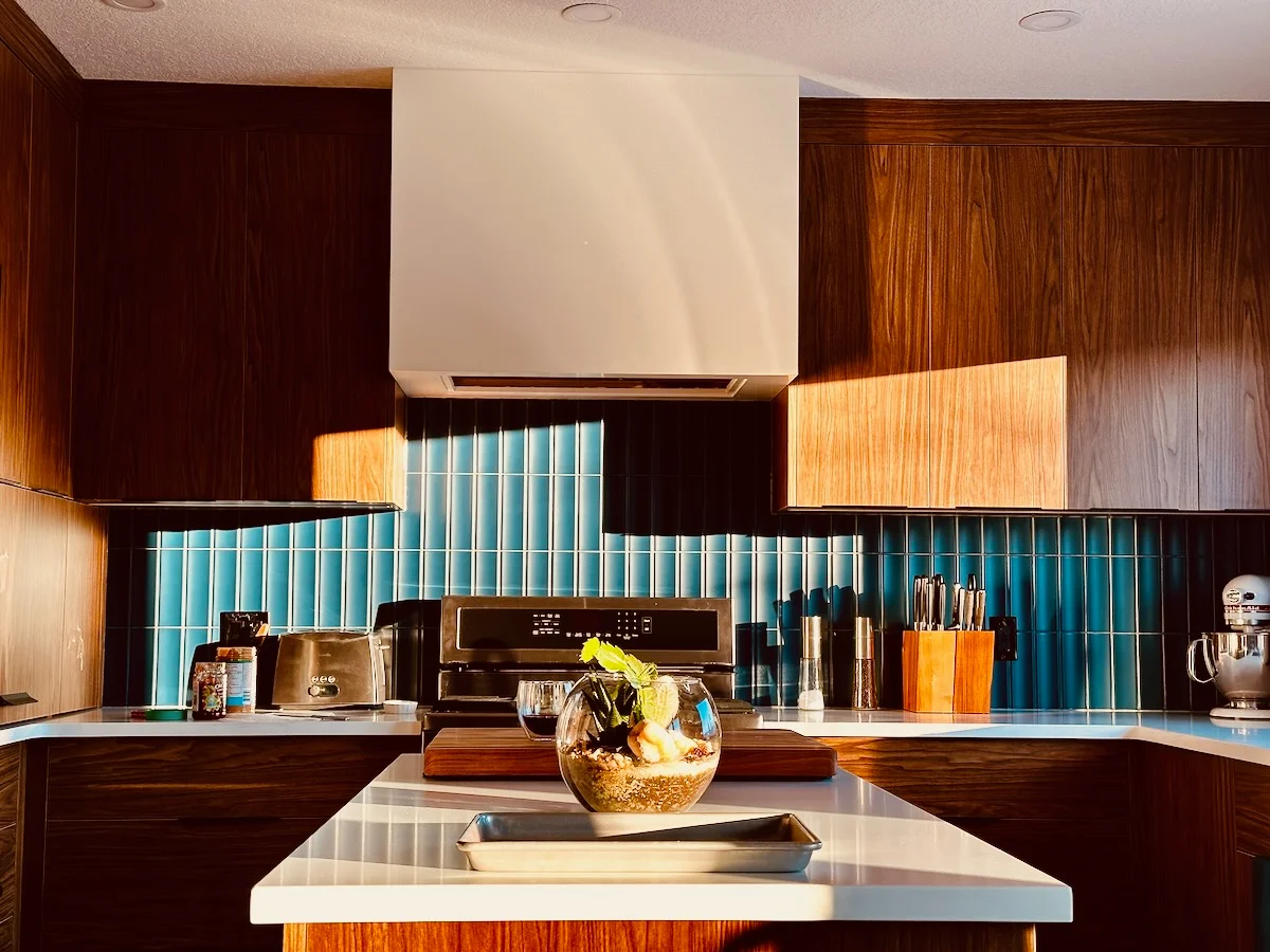 morning coffee lightNovember 30, 2025kitcheninterior designmoderndecormorning coffee lightA stylish and modern kitchen with dark wood cabinets, a bright tiled backsplash, and a glass bowl containing a decorative plant arrangement on the countertop.Photo by D'Arcy Norman