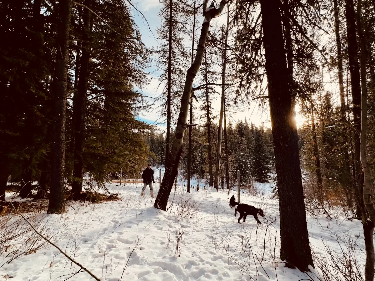 hunting for treesDecember 6, 2025naturewinterlandscapesnowforesthikingtreeshunting for treesA snowy winter scene in a forest, with a person walking on a path and a dog running through the snow. The sun is setting, casting a warm glow through the trees.Photo by D'Arcy Norman