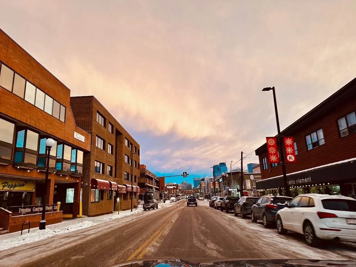 chinook over kensingtonDecember 13, 2025chinook over kensingtonA snowy street in a city, with brick and wooden buildings, cars parked on the side, and a colorful sky with a sunset-like glow.Photo by D'Arcy NormanLast updated: December 13, 2025cityarchitecturewintersnowweatherurban