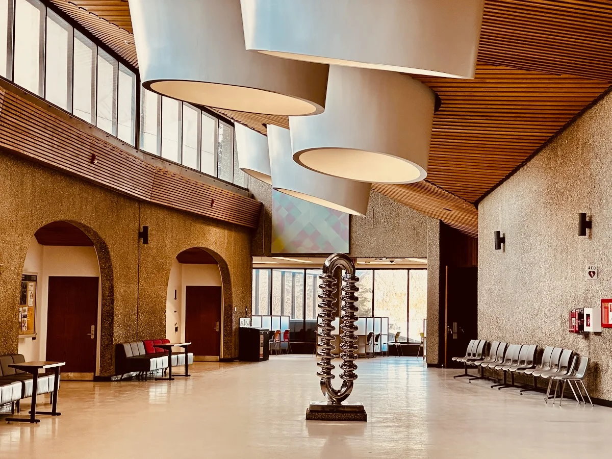 The image depicts a modern and minimalist interior design with wooden accents, large windows, and suspended lighting fixtures. A sculptural piece stands prominently in the center of the space, which appears to be a lobby or public area of a building.