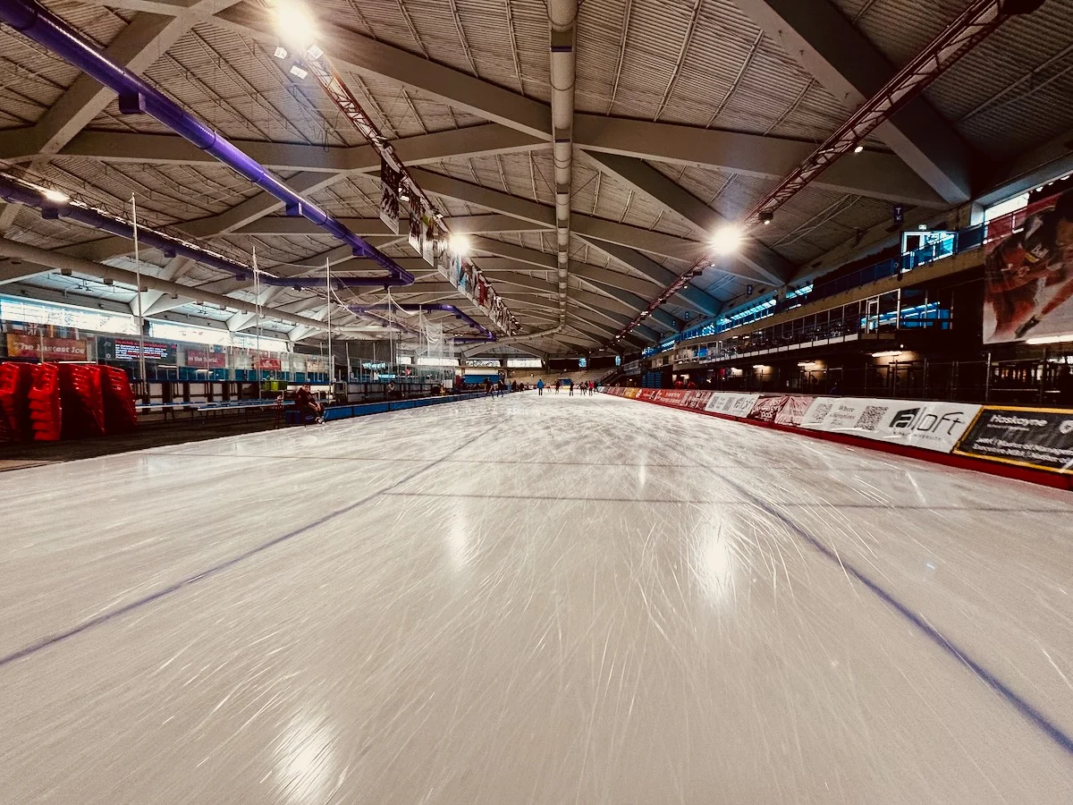 A vast indoor ice skating rink with a smooth, reflective surface and spectator seating around the perimeter. The ceiling is high and features steel beams and lighting, creating an impressive and spacious atmosphere.