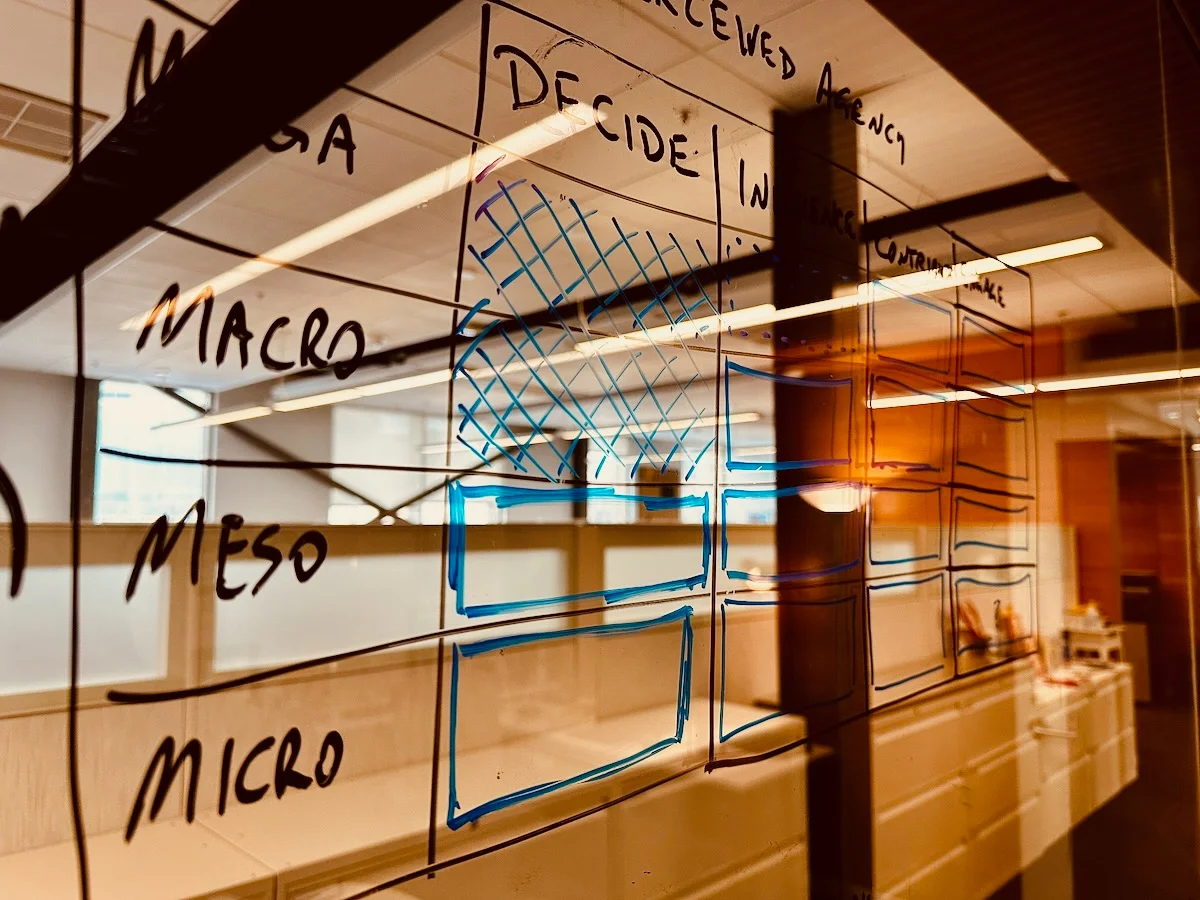 frameworkingJanuary 26, 2026frameworkingAn image of a cluttered hallway with handwritten notes and diagrams on the walls, including the words 'Macro', 'Meso', and 'Decide'.Photo by D'Arcy NormanLast updated: January 26, 2026handwrittenchaoswhiteboardglassoffice