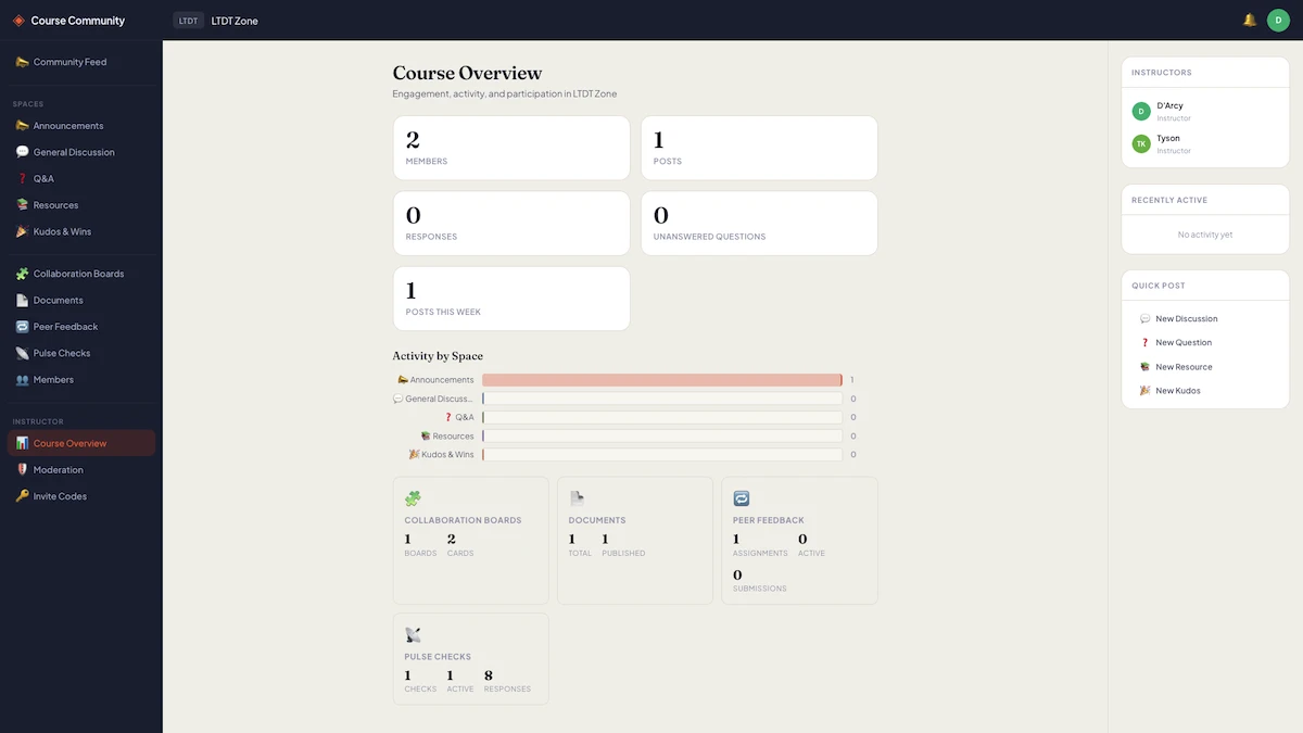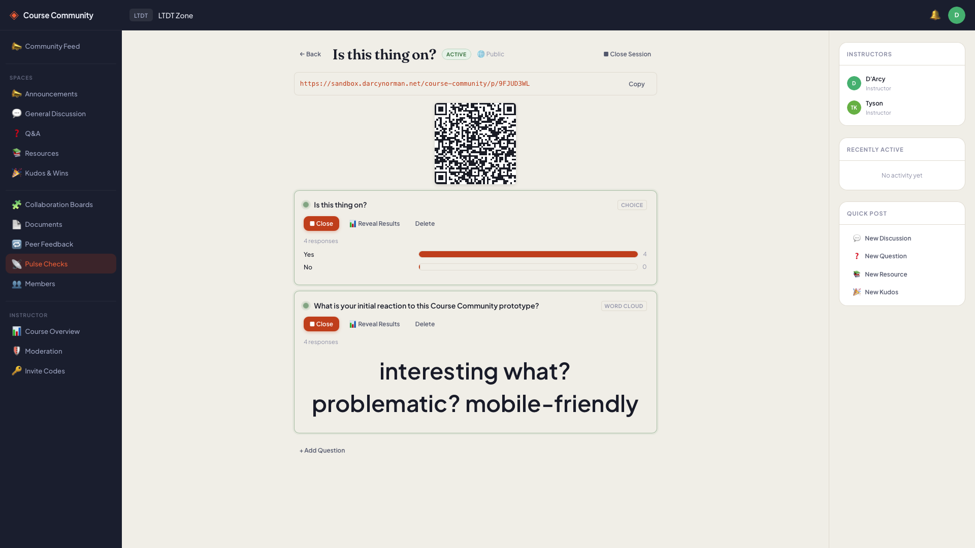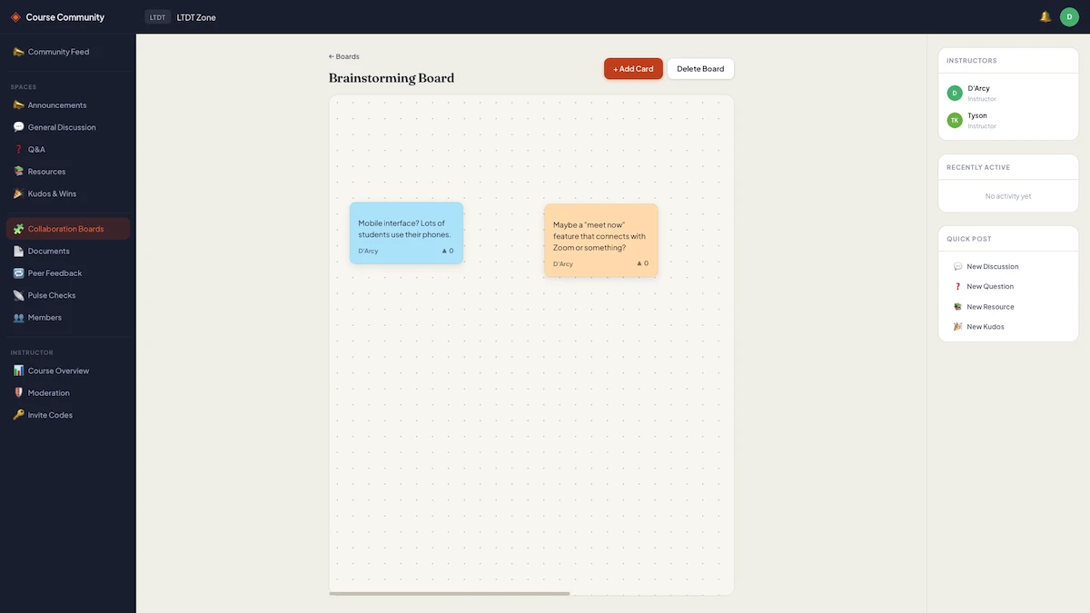 Notably, there is no gradebook or assignment submission tool. The application is aimed entirely at providing tools to use within the context of a course to foster community and collaboration between students and with their instructor. The LMS can do grades and assignments and quizzes, so there’s no need to duplicate that. And, with the LTI integration, this application can become part of the course within Brightspace.