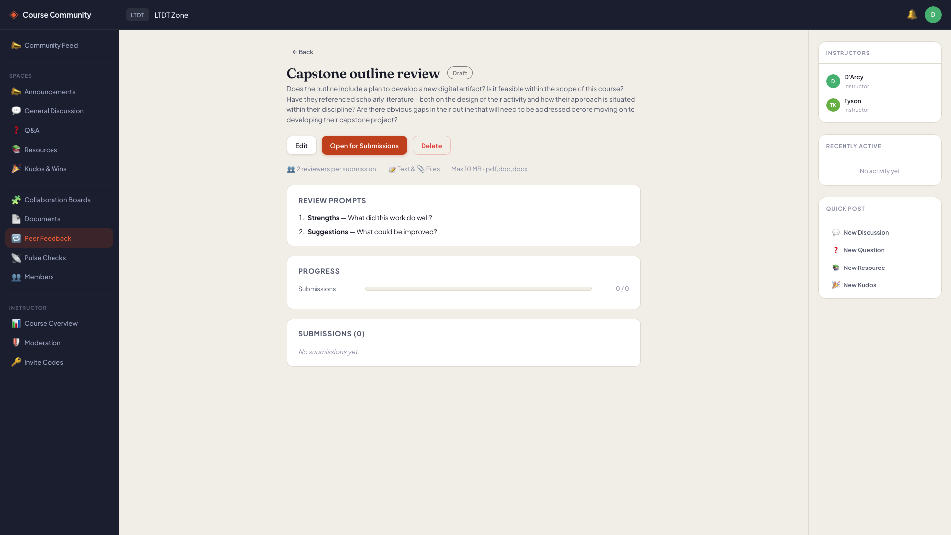 I want to build a web application that will provide rich community interaction between students and instructors within a course. It’s not just a discussion board replacement - it’s a full community environment where people in a course can communicate, collaborate, co-create, give and receive feedback, and more. I want the application to be relatively portable - you can use PHP and SQLite - and it needs to integrate with Brightspace as an External Learning Tool using the LTI specification (which will also handle authentication and course info etc.). Use what you know of innovative and high-impact teaching and learning practices and develop a working prototype that we can try out in a course.