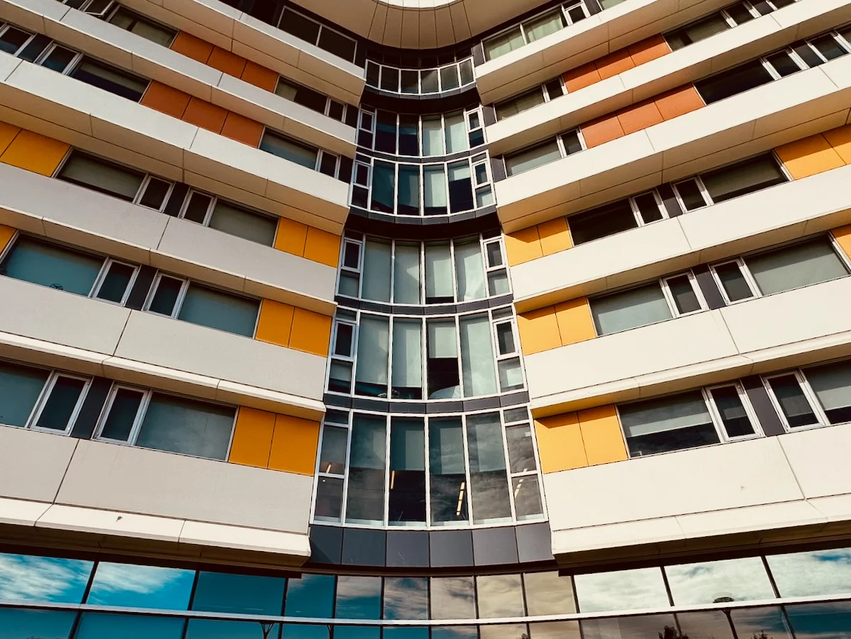 Modern multi-story building with a curved facade featuring a mix of neutral and warm-toned panels, accented with large rectangular windows. The architectural design emphasizes geometric patterns and clean lines, giving it a contemporary urban aesthetic.