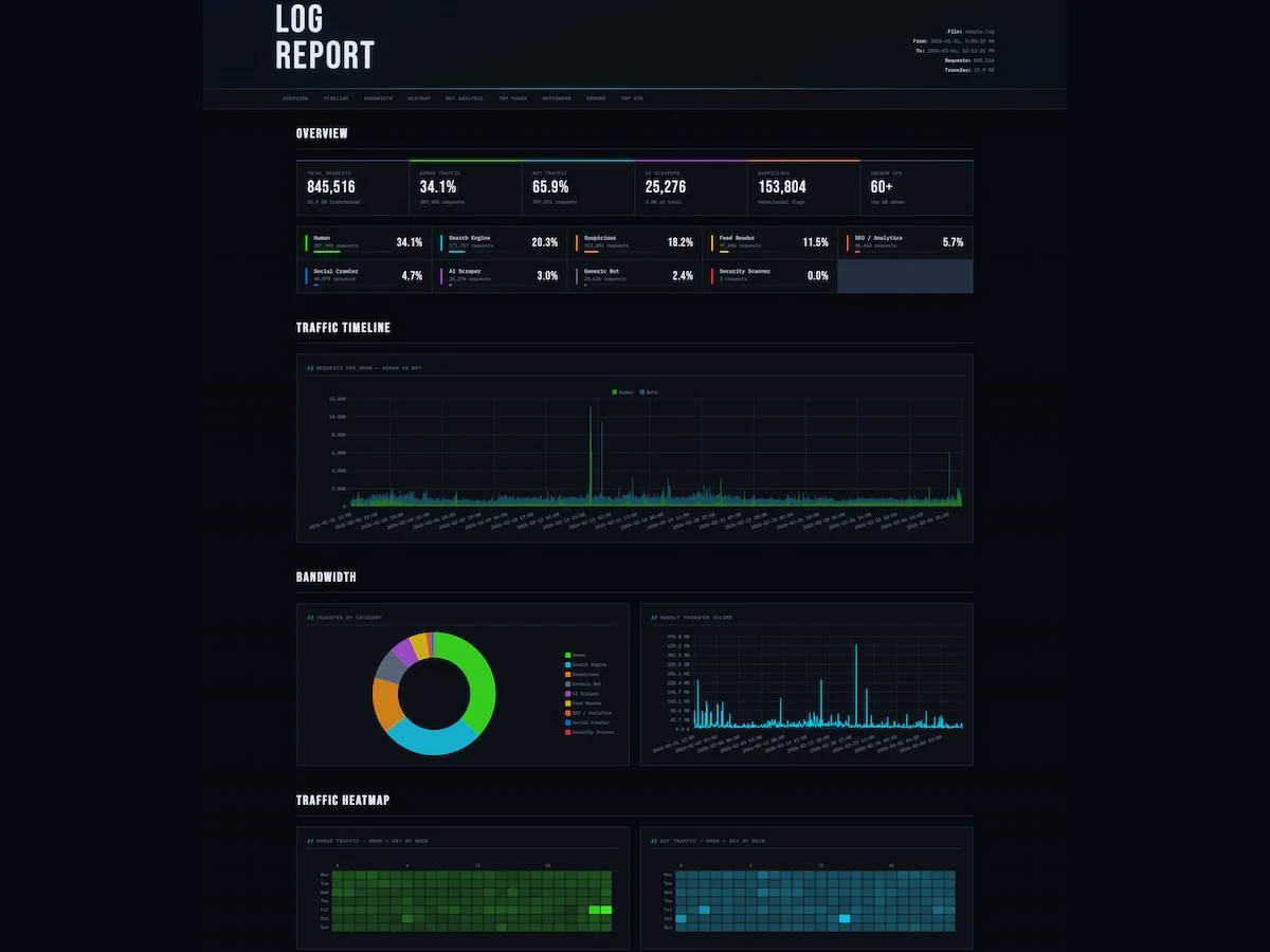 A dark-themed log analytics dashboard displaying network traffic metrics, including request counts, traffic sources, bandwidth usage, and time-based graphs for monitoring web server or network activity. The visualization breaks down data into categories such as human requests, bot traffic, and error rates, alongside heatmaps and timelines for deeper insights into traffic patterns.