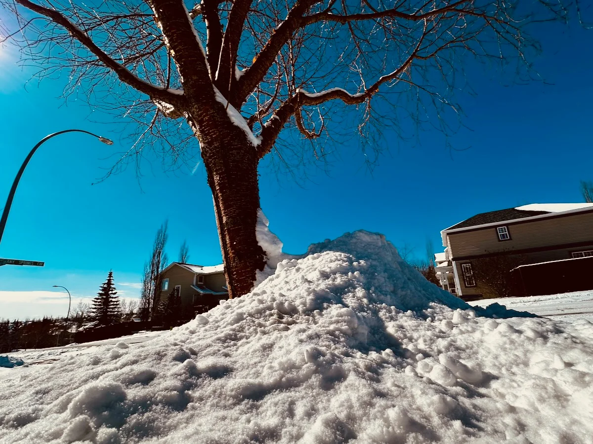 A serene winter scene featuring a snow-covered residential area with a large pile of snow beside a tree, a house, and a clear blue sky. The scene captures the quiet beauty of a snowy day in a suburban neighbourhood.