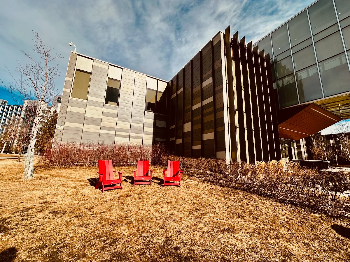 A striking modern architectural facade featuring a split design with horizontal and vertical panels, meeting a glass-covered section with an adjacent wooden overhang. Dry, brown grass covers the ground before it, with a lone, bare tree positioned to the left, all framed by a bright and crisp sky.