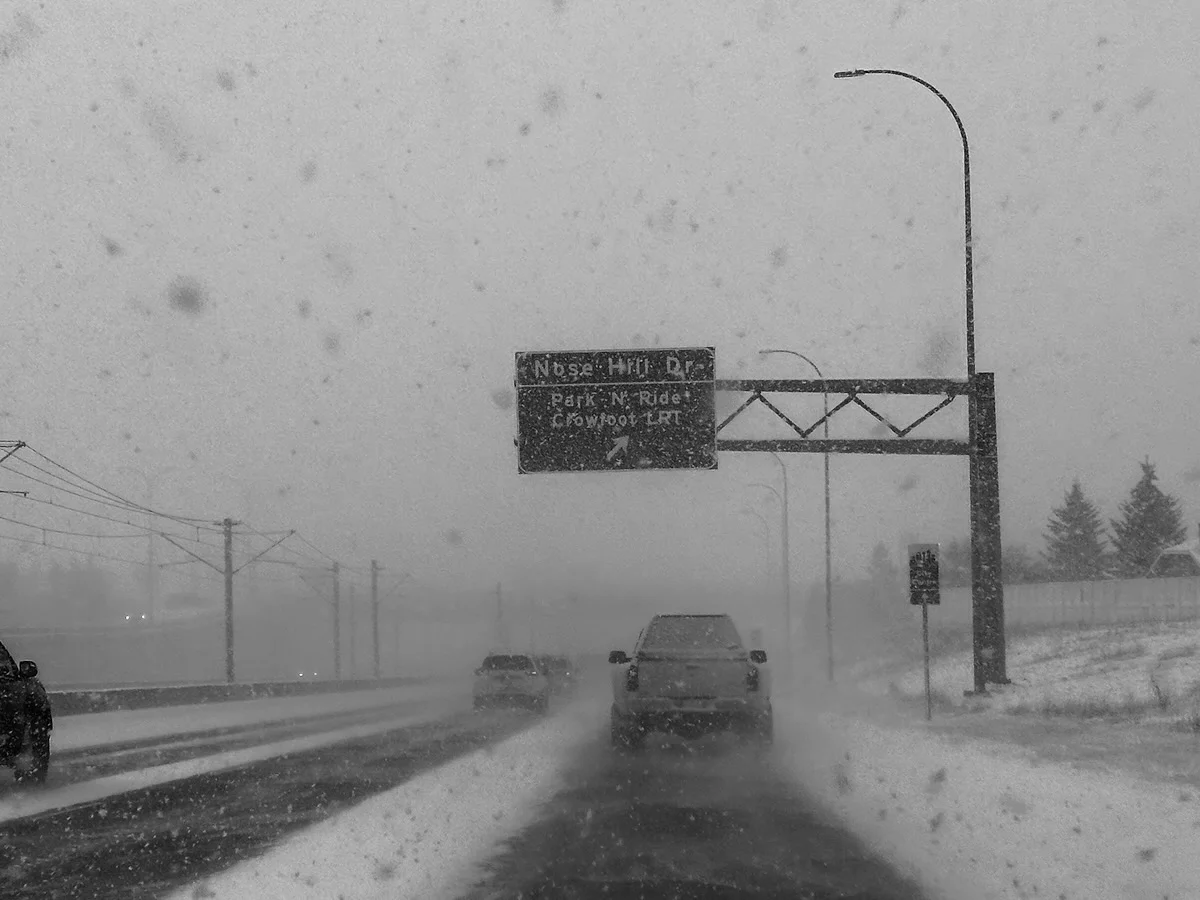 surprise third winterMarch 25, 2026weatherwintersnowtransportationhighwayblizzardurbansurprise third winterA heavy snowstorm obscures the highway as vehicles navigate through poor visibility near road signs for Nose Hill Drive and Park N Ride Crowfoot LRT in what appears to be a Canadian winter storm.Photo by D'Arcy Norman