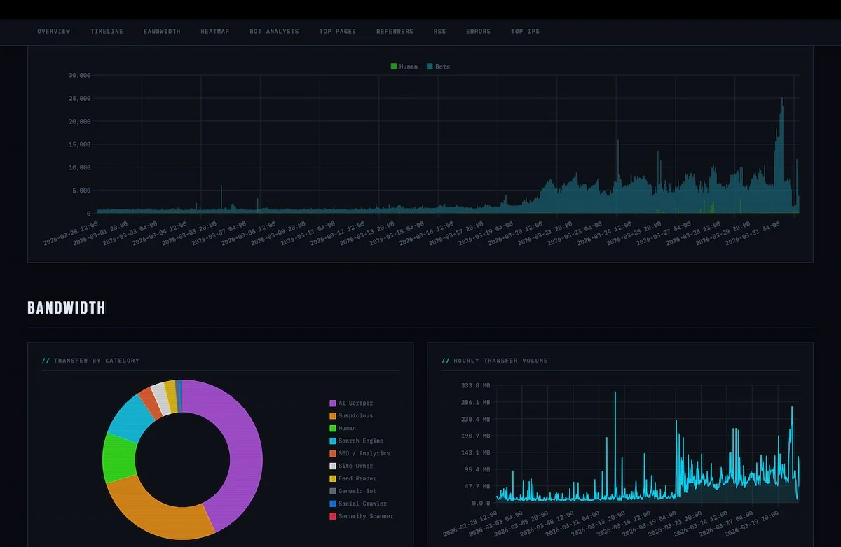 battlebotsMarch 31, 2026screenshotchartswebserverBattlebotsscreenshot of aggregated webserver stats for my website, visualizing the sheer volume (over 95%!!!) of bot-driven traffic compared to that from puny humans.Photo by D'Arcy Norman