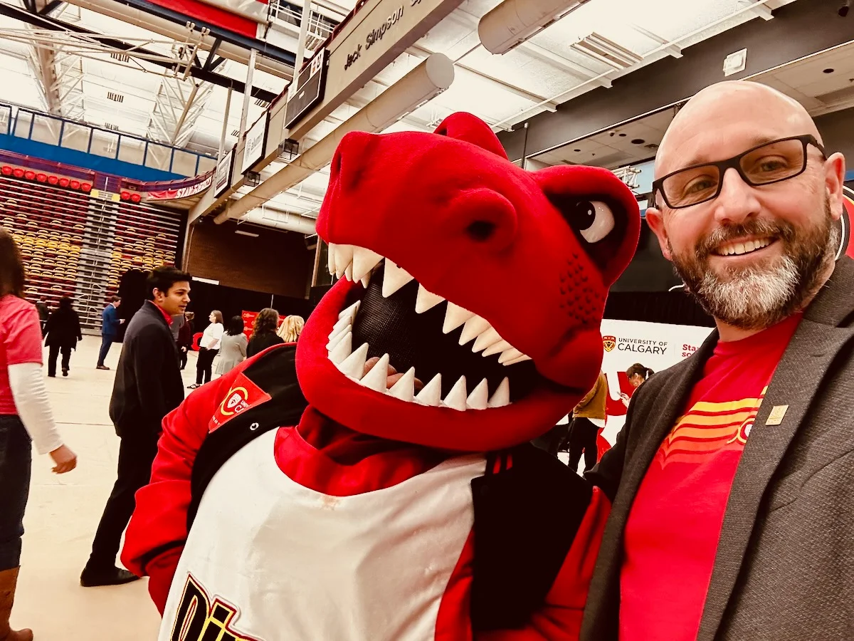 a dinosaur and rexApril 13, 2026mascotsportsuniversityeventselfieremixucalgarya dinosaur and rexA man poses with a red dinosaur mascot at an indoor sports arena or gymnasium, with the University of Calgary visible in the background signage.Photo by D'Arcy Norman(the man is me. the red dinosaur mascot is Rex O’Saurus)