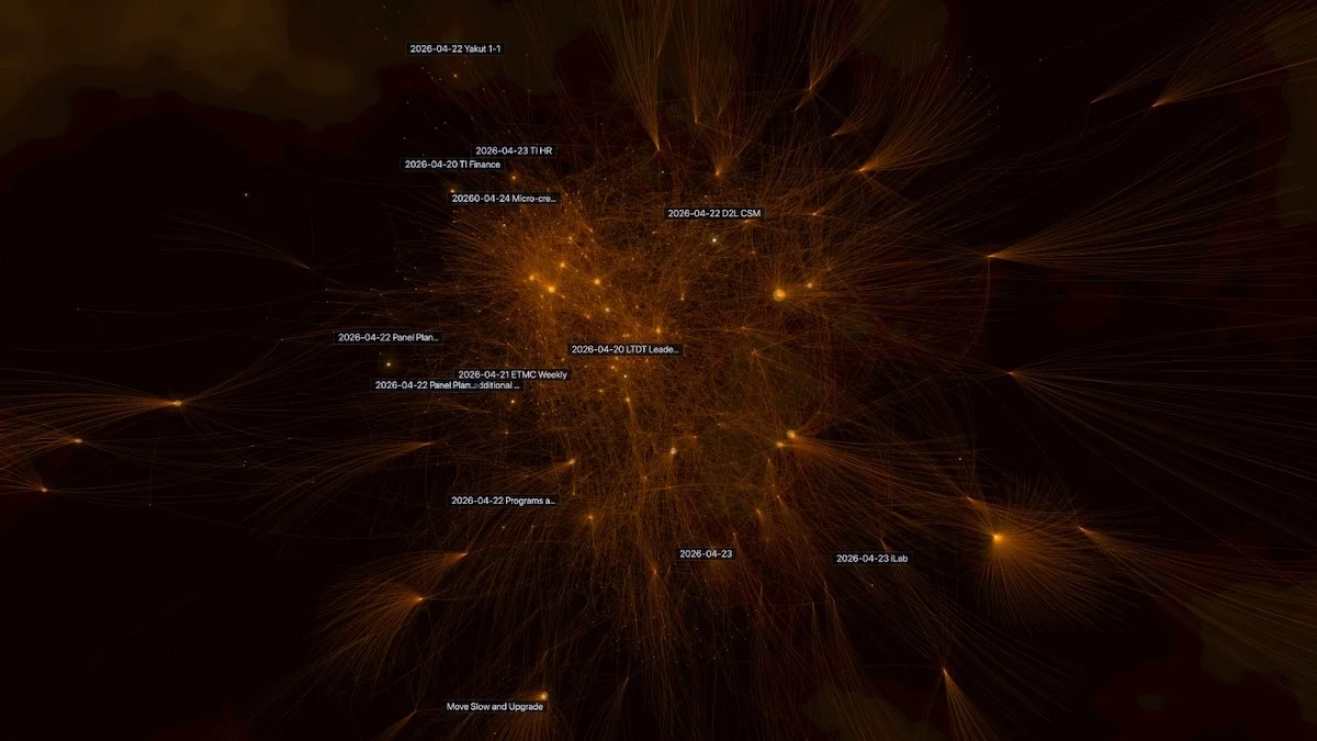 A network visualization showing interconnected nodes and data points from April 2026, with golden/orange lines radiating outward against a dark background, resembling a complex system map or knowledge graph.