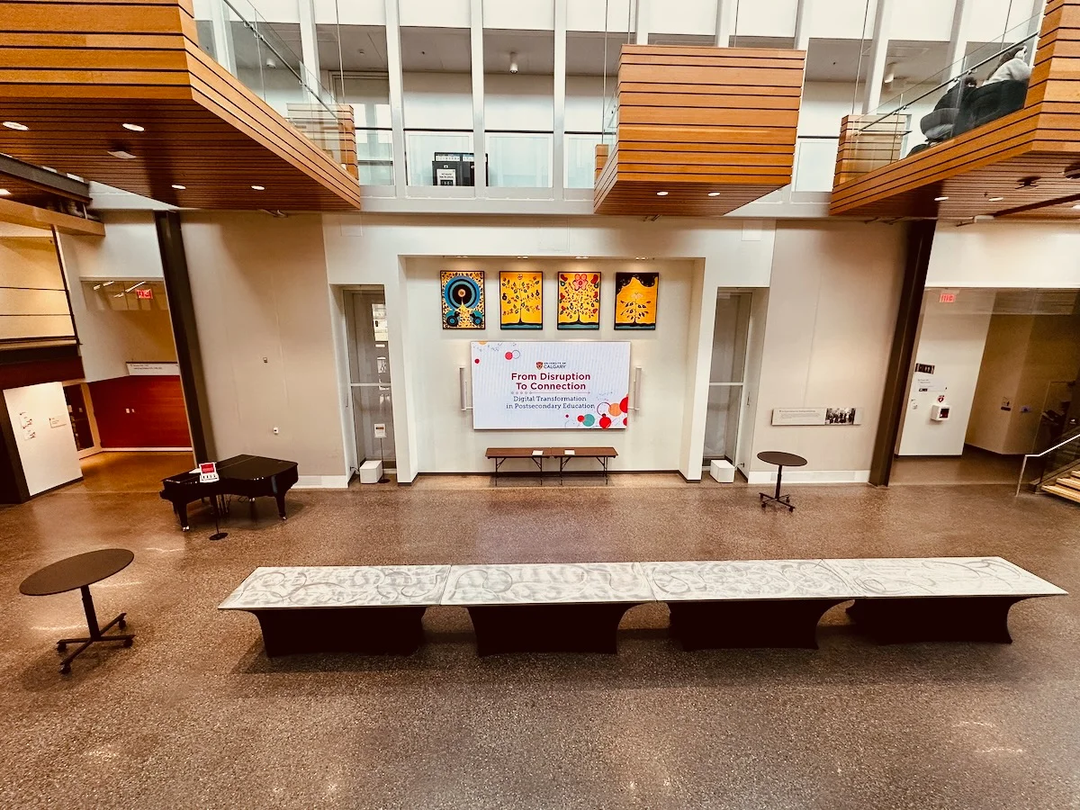 A modern educational atrium or gallery space featuring wooden ceiling elements, colorful artwork displays, and a long bench seating arrangement facing a presentation screen about digital transformation in postsecondary education.