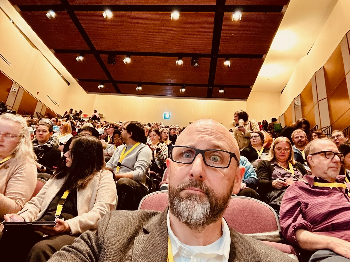 A man with glasses and a beard takes a selfie in a crowded auditorium or conference hall filled with seated attendees. The venue features warm lighting, wooden ceiling beams, and appears to be a formal gathering or event.